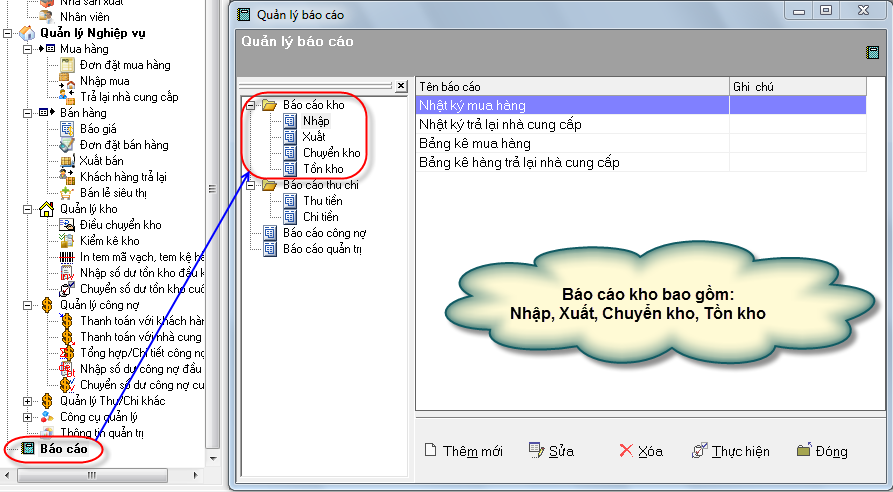 Báo cáo kho bao gồm Báo cáo: Nhập, Xuất, Chuyển kho, Tồn kho