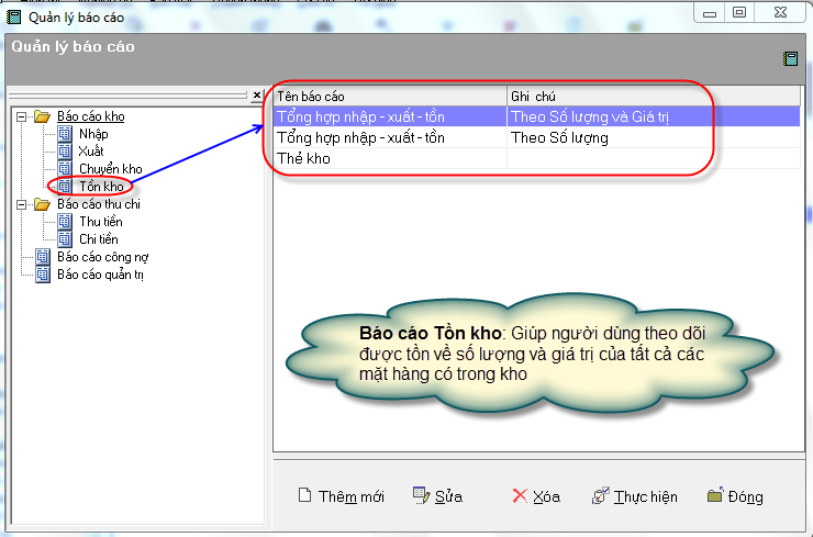 Báo cáo Tồn kho: Giúp người dùng theo dõi được tồn về số lượng và giá trị của tất cả các mặt hàng có trong kho.