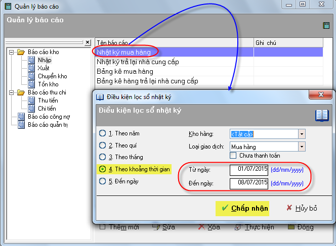 - Nhật ký mua hàng: Chọn kho hàng, và khoảng thời gian cần xem
