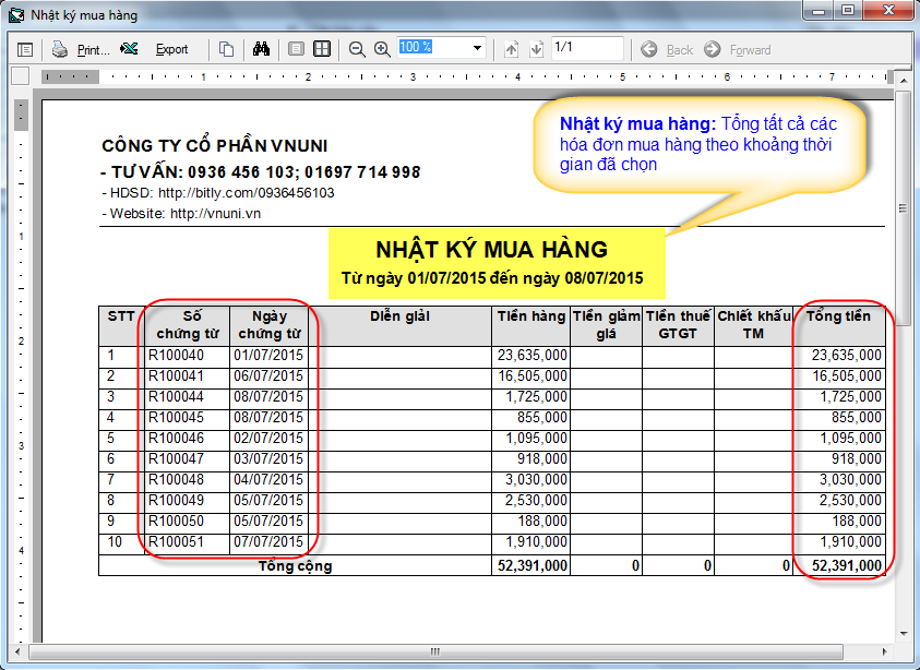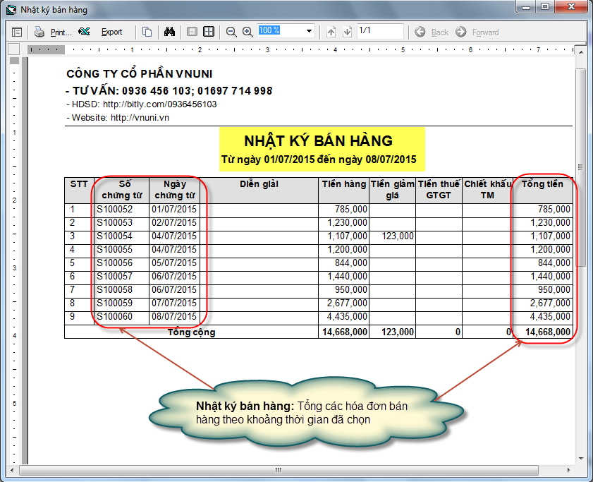 - Nhật ký bán hàng: Tổng tất cả các hóa đơn bán hàng theo khoảng thời gian đã chọn