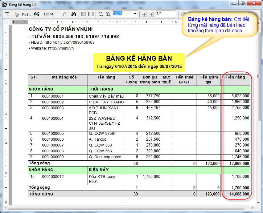 - Bảng kê hàng bán: Chi tiết từng mặt hàng đã bán