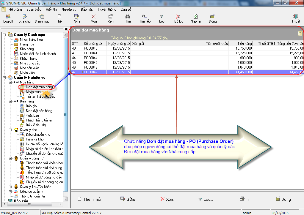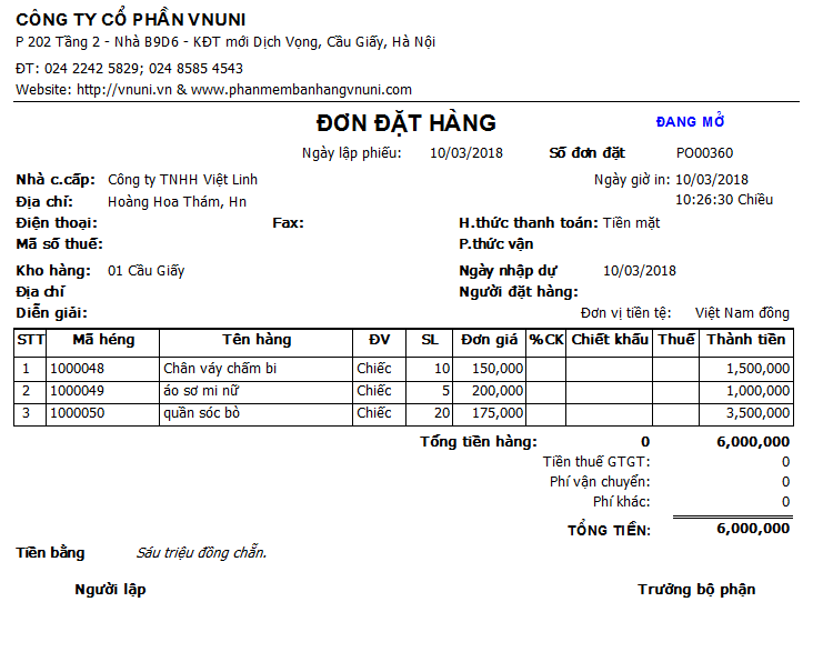 Chức năng Đơn đặt mua hàng trong phần mềm bán hàng VNUNI (PO (Purchase Order)): Cho phép người dùng có thể đặt mua hàng và quản lý các Đơn đặt mua hàng với Nhà cung cấp.