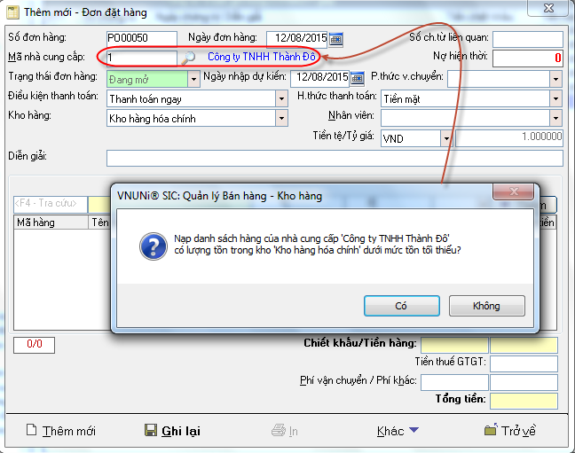 Nếu chọn có thì phần mềm tự động chọn các mặt hàng của NCC này có mức tồn tối thiểu <=0 hoặc bằng số lượng tồn tối thiểu đã được đặt ở danh mục hàng hóa.