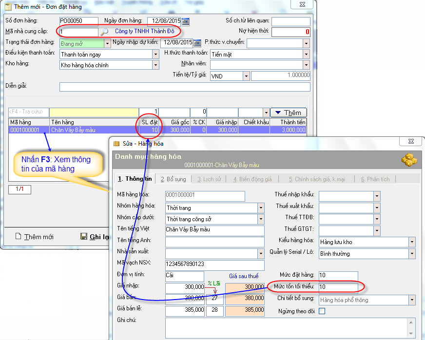 - Mã hàng: Mã của “Hàng hóa” cần đặt hàng, “Mã hàng” được lấy ra từ danh sách “Hàng hóa” có trong danh mục “ Hàng hóa” của chương trình.