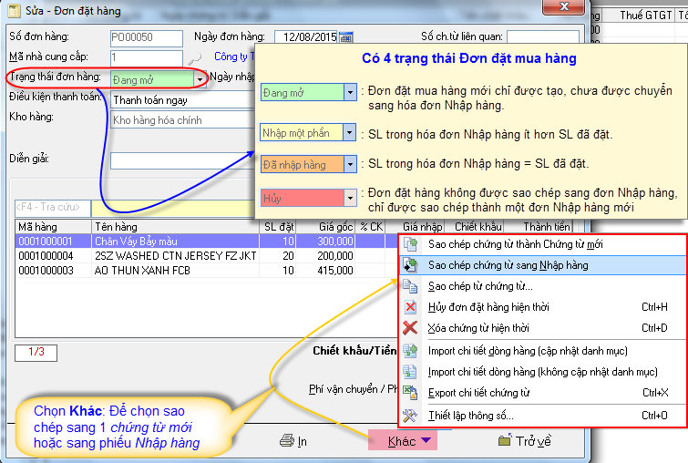 Sao chép chứng từ sang nhập hàng: Chức năng này cho phép người dùng sao chép “Đơn đặt mua hàng” sang một chứng từ “Phiếu nhập” mới.