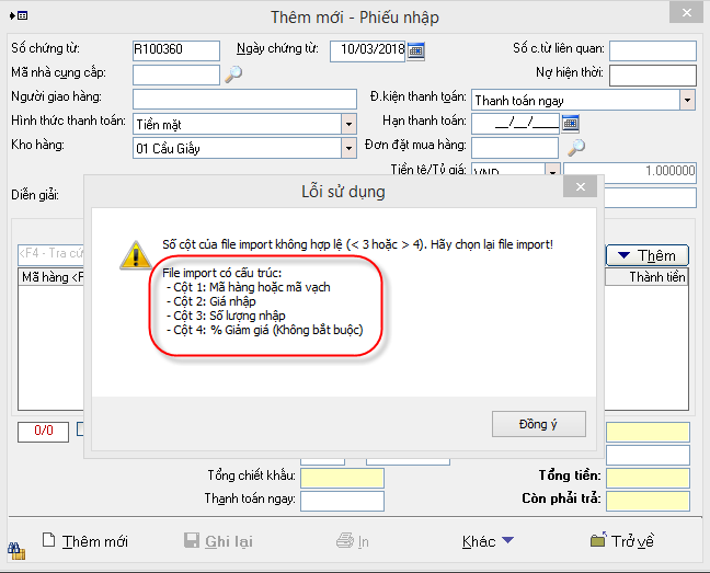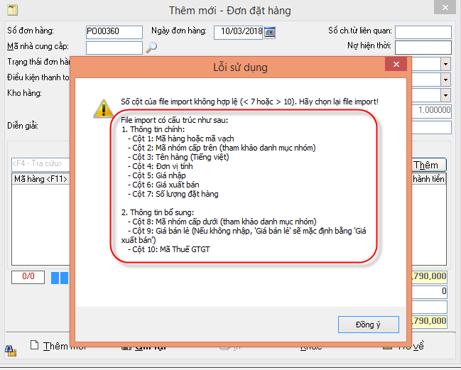 * Import chi tiết dòng hàng (Không cập nhật danh mục): Là import những mã hàng đã có trong danh mục hàng hóa, nên file .cvs chỉ cần 4 cột như thông báo dưới