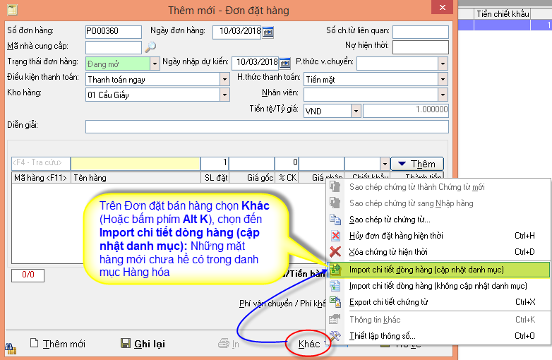 Trên Đơn đặt hàng: Người dùng chọn Khác hoặc bấm Phím tắt là Alt K, sau đó di chuyển mũi tên trên bàn phím để chọn đến Import chi tiết dòng hàng có cập nhật hoặc không cập nhật danh mục.