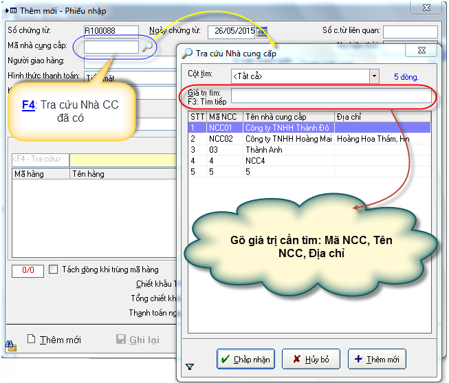 + Nếu Nhà CC đã có: Nhấn F4 để tìm kiếm Nhà CC