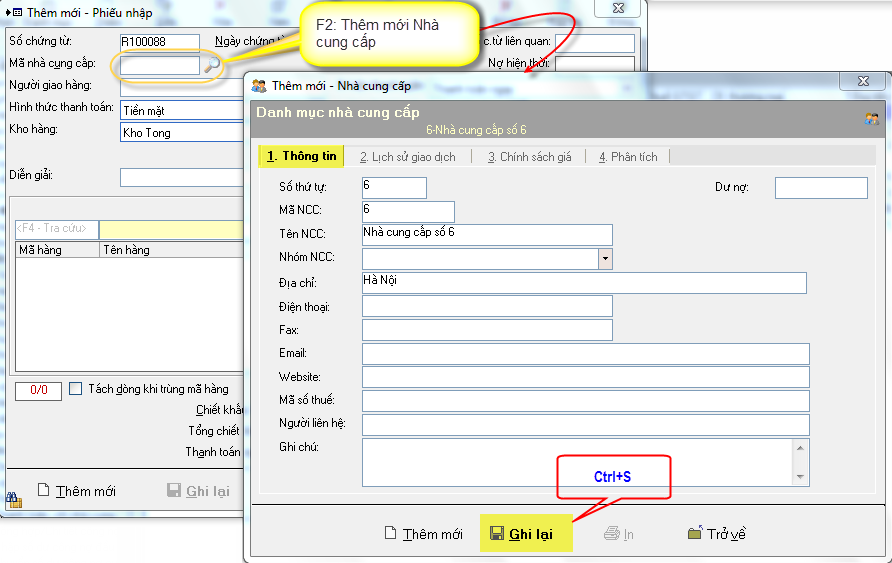 Chọn Thêm mới (Ctrl+N): Enter 3 lần xuống ô Mã nhà cung cấp: