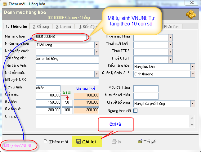 Sau khi điền xong thông tin của sản phẩm -> Nhấn ctrl+S (Để lưu thông tin)-> enter 2 lần: Gõ số lượng vào ô SL -> Nhấn Ctrl+A (hoặc kích vào chữ Thêm hàng): để thêm mặt hàng xuống dòng