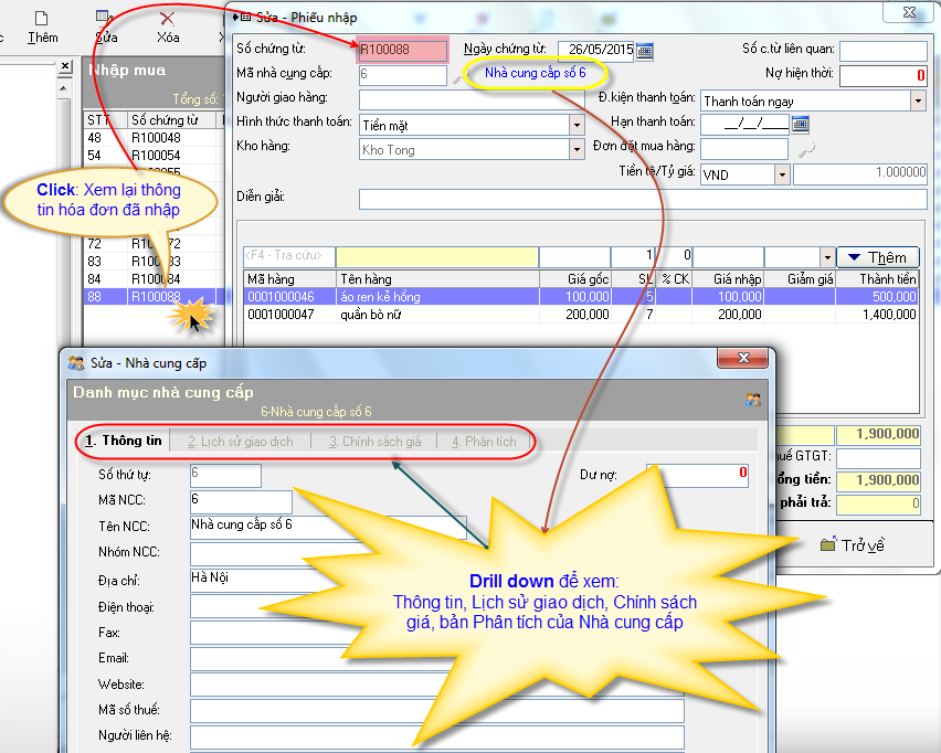 - Drill-Down nhanh về thông tin Nhà Cung Cấp