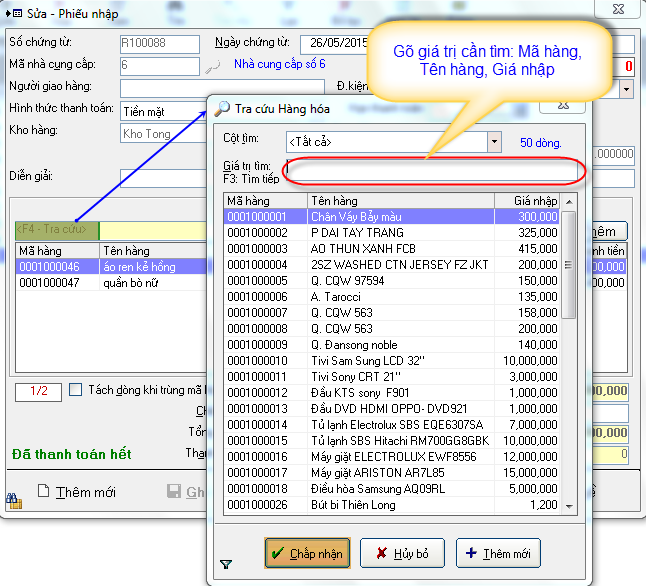 Sau đó Nhấn F11 về ô mã hàng - Nhấn F4: Để tra cứu (Có thể gõ mã, hoặc tên, giá nhập) ->enter gõ số lượng vào ô SL. -> Ctrl+A: Thêm xuống dòng. -> Ctrl+S: Ghi lại phiếu nhập