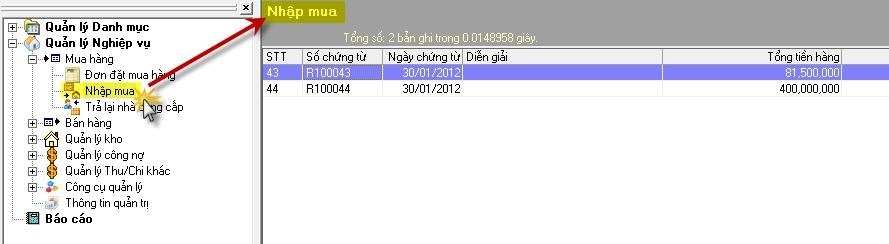 Thao tác: Chọn Quản lý nghiệp vụ -> Mua hàng-> Nhập mua: