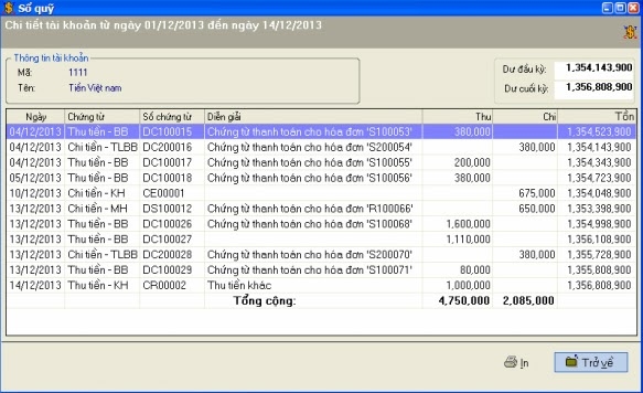 + [Phát sinh có (Chi)]: Các khoản chi tiền Nhập hàng, chi tiền Khách hàng trả lại và chi khác