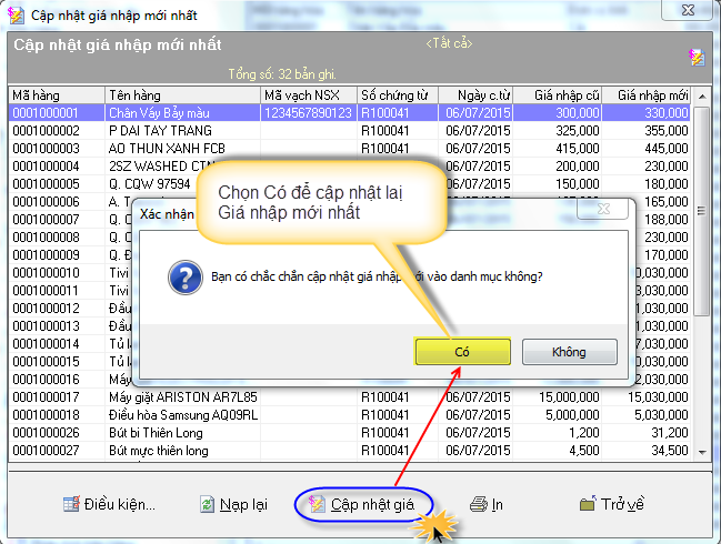 -> Chọn Cập nhật giá -> Nếu chắc chắn muốn thay đổi lại giá nhập trên danh mục bằng giá nhập mới nhất thì chọn Có