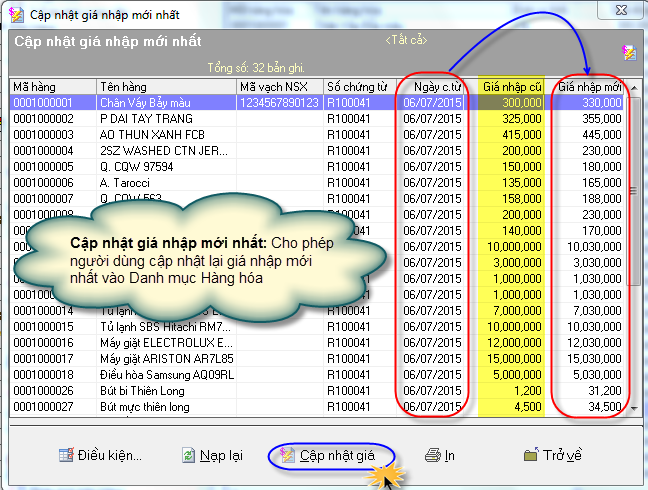 Nếu sau một thời gian nhập hàng giá nhập thay đổi thì người dùng nên sử dụng Chức năng Cập nhật giá nhập mới nhất để khi nhập hàng không phải gõ lại giá.