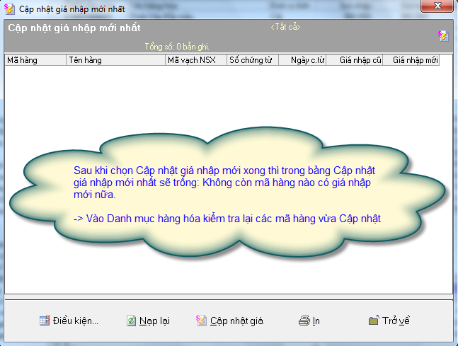 Tại màn hình Cập nhật giá nhập mới nhất: Người dùng sẽ biết được các mã hàng, tên hàng nào có giá nhập mới nhất.