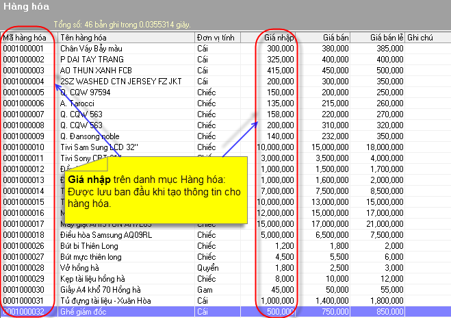 - Giá nhập cũ: Giá trên danh mục hàng hóa;