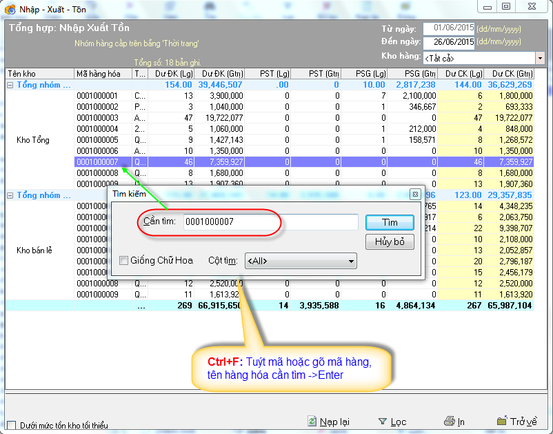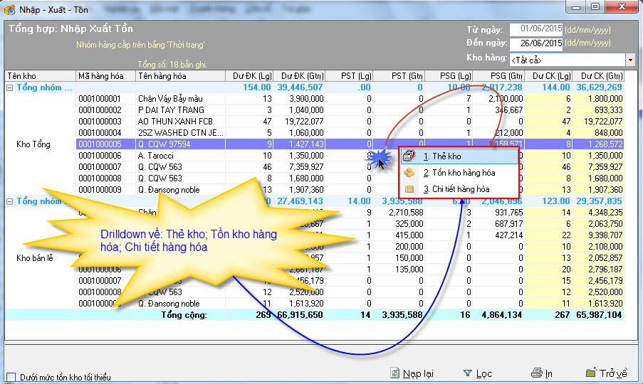Ví dụ: Muốn xem Nhập-Xuất-Tồn của 1 nhóm hàng là "Thời trang"