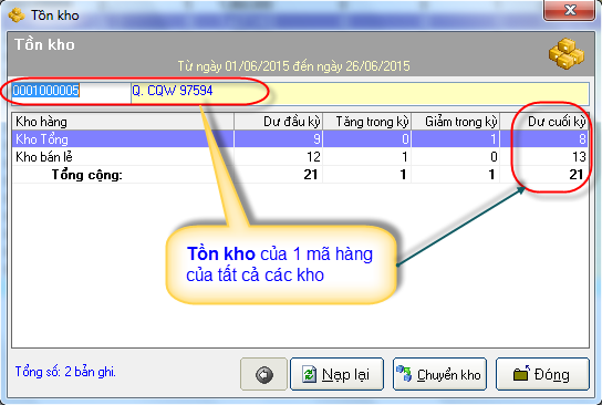 + 2. Tồn kho: Tồn kho của các kho theo chiều dọc
