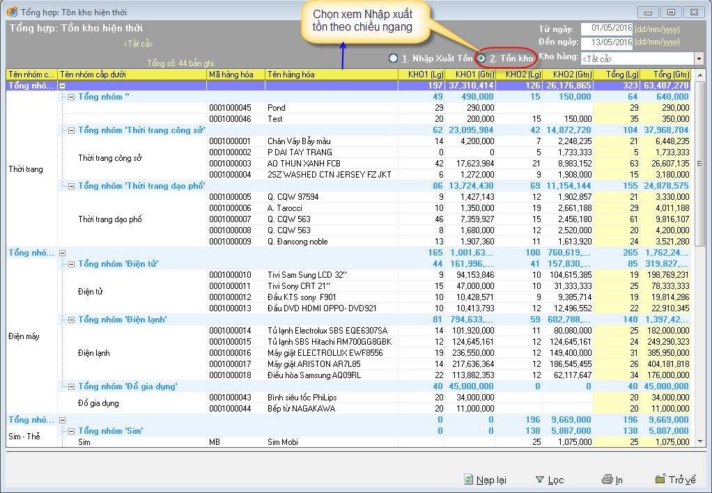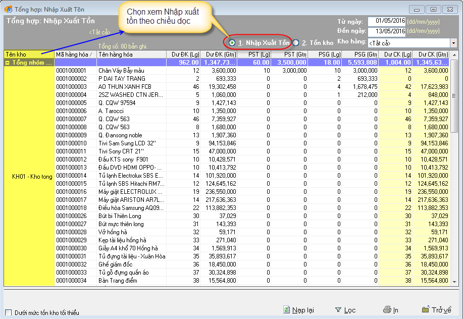 + 1. Nhập xuất tồn: Tồn kho của các kho theo chiều dọc