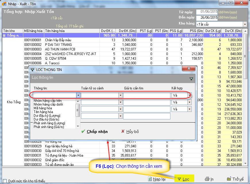 Tại màn hình này Tổng hợp Nhập-Xuất-Tồn người dùng có thể chọn Lọc (F6): Để lọc thông tin chi tiết cần xem