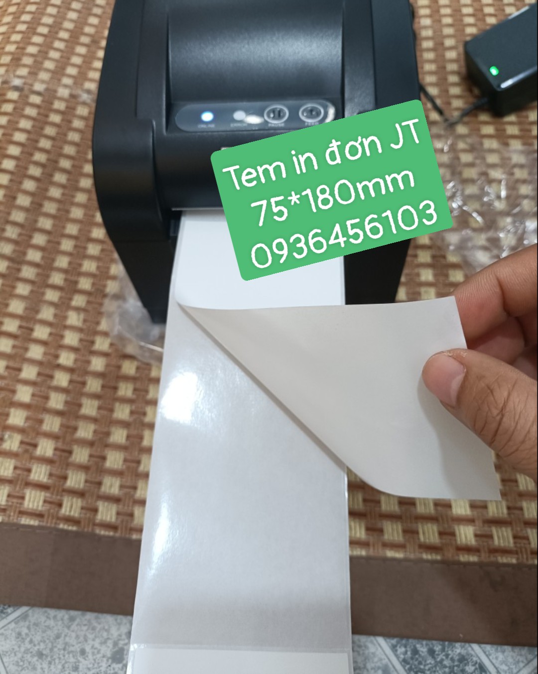 Giấy in tem mã vận đơn J&T Express khổ 75*180mm in qua điện thoại: Là giấy decal nhiệt, in xong bóc dán lên các gói hàng.