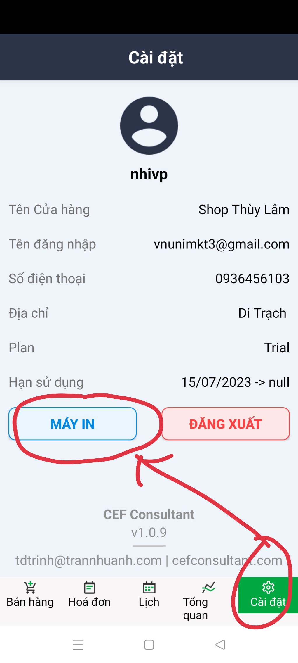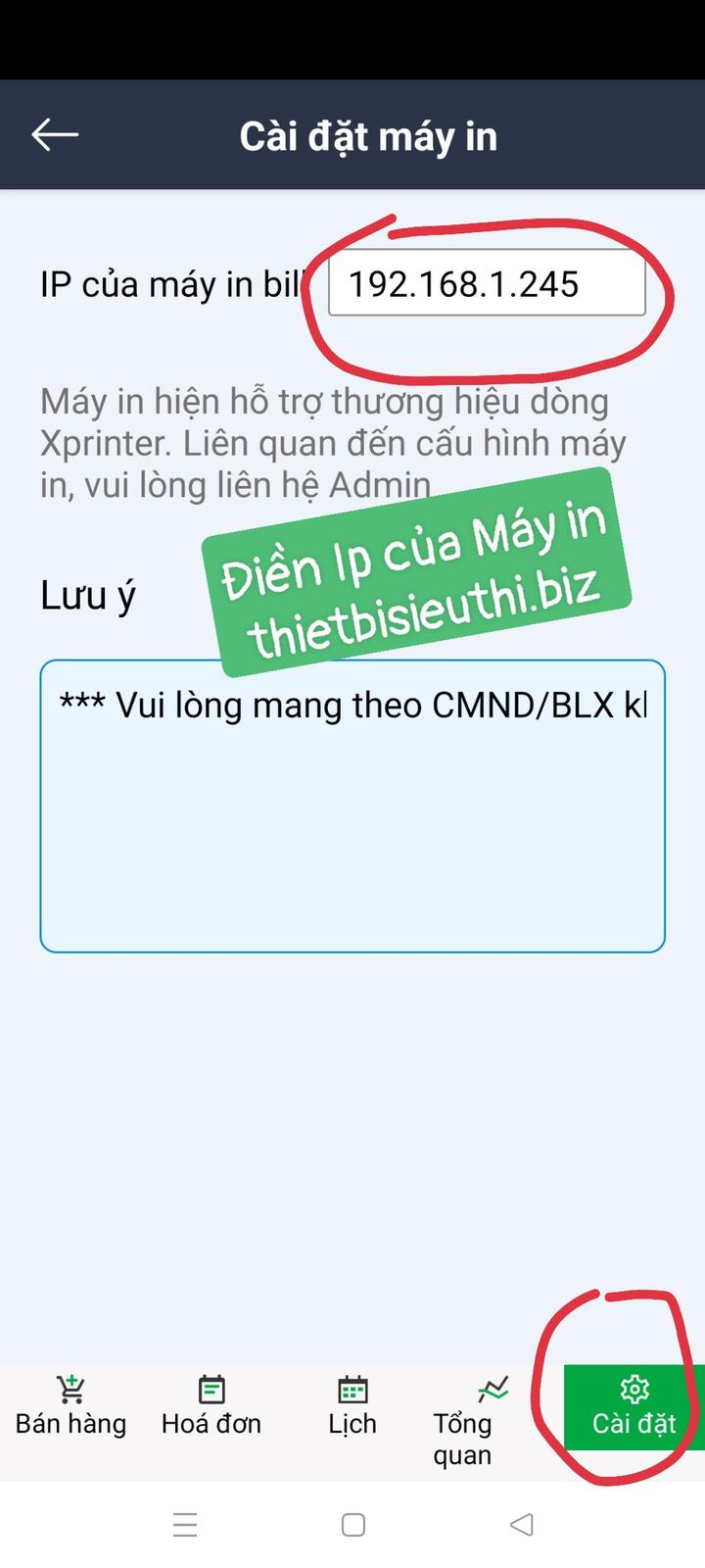 Cách kết nối máy in rất đơn giản. Đăng nhập vào app RentaShop -> chọn mục Cài đặt -> Máy in -> Điền địa chỉ IP của máy in (Ip của máy in đặt trùng 3 số đầu với wifi tại cửa hàng.