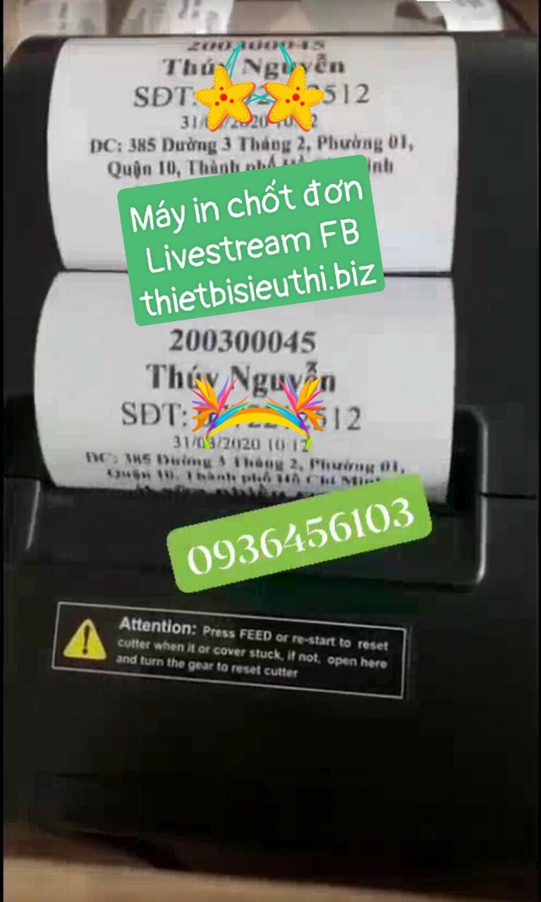 Thường các phần mềm chốt đơn livetreams facebook hay sử dụng các máy in hóa đơn khổ giấy in là 8cm, bởi in xong tự cắt giấy chỉ cật giật nhẹ ra không phải xé giấy. Giúp việc chốt đơn trở nên nhanh chóng hơn.