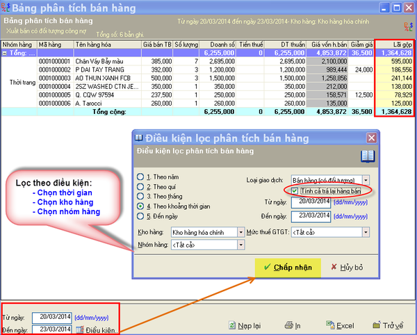 Mặc định tại bảng Điều kiện lọc phân tích bán hàng chưa tính Doanh thu, Lãi gộp khi khi có hàng trả lại. Muốn xem Doanh thu, Lãi gộp đã trừ hàng trả lại thì chọn Tích vào ô Tính cả trả lại hàng bán.