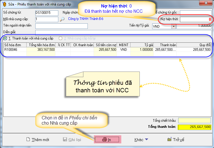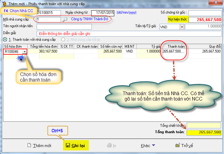 Chọn Thêm mới (Ctrl+N): Tại ô Mã NCC nhấn F4 chọn NCC cần thanh toán -> Phần mềm tự hiện số tiền đang nợ của NCC tại ô Nợ hiện thời. Có thể điền thông tin diễn giải hoặc bỏ trống. Click chọn Số hóa đơn cần thanh toán. Có thể gõ số tiền cần thanh toán vào ô Thanh toán -> Ghi lại (Ctrl+S).