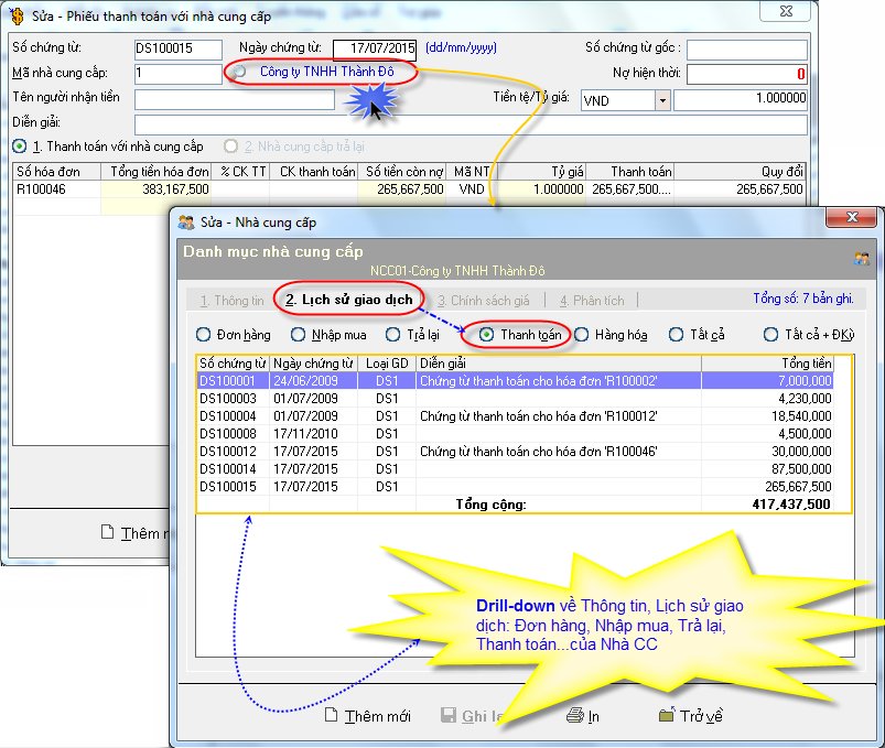 Có thể Click vào Nhà CC để Drill-down chi tiết về Thông tinh, Lịch sử giao dịch, Chính sách giá...của Nhà cung cấp đó:
